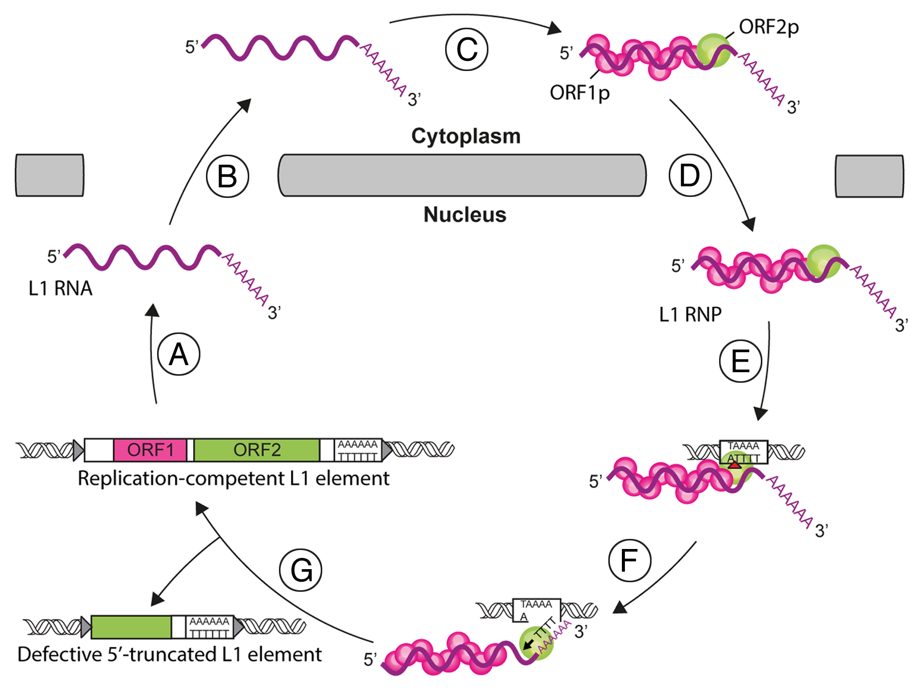 | The role of retrotransposition as a source of genetic diversity and diseases in humans has been shown by many studies. Advances in deep-sequencing technologies have shed a new light on the extent of L1-mediated genome variations. They have also lead to the discovery that L1-HS is not only able to mobilize in the germline - resulting in inheritable genetic variations - but can also jump in somatic tissues, such as embryonic stem cells, neuronal progenitor cells, or in many cancers. |